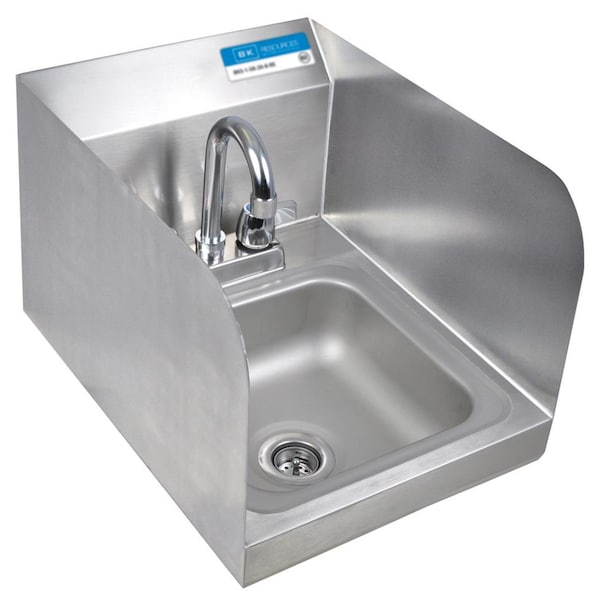 BK Resources wall-mount sink, the Perfect 304 Stainless Steel Space Saver Hand Sink With Side Splashes for use in a kitchen, bar, restaurant, laundry, school, hospital, hotel, park, or any other commercial setting, 9" Wide X 9" Front-To-Back Bowl, 4" O.C. Deck Mount Faucet Holes With Workforce Splash Mount Faucet W/3.5" Gooseneck Spout, 1-7/8" Drain Opening, 1-7/8" Drain Opening, Basket Drain & Mounting Bracket Included, NSF