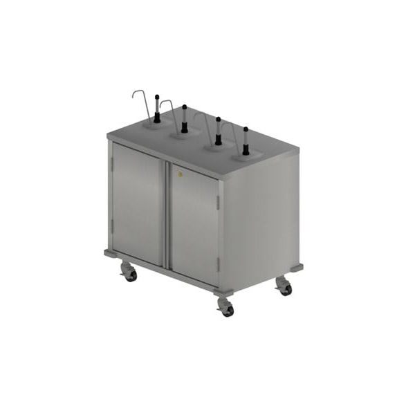 This single sided condiment cart measures 36"Wx24"D. It is made from T-304 14 Ga Stainless Steel with 18 Ga Body. This cart has locking hinged doors and corner bumpers. The 3" casters have a top lock break. The remote dispensers are manually operated and have six pumps. This cart has a 3-10 day lead time.