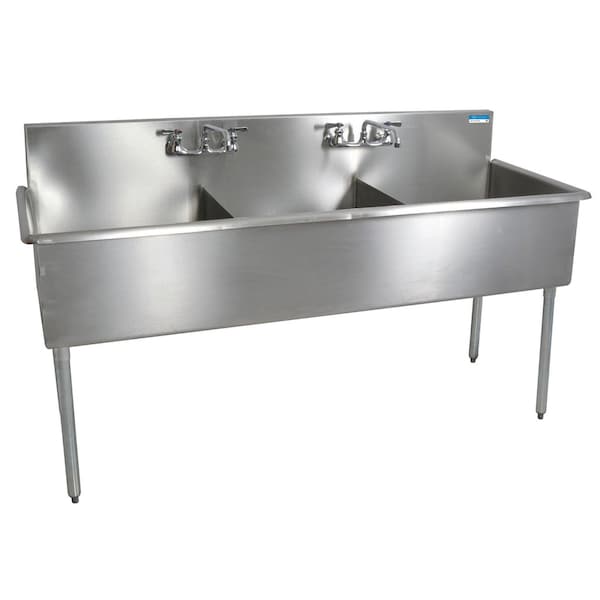 Three compartment budget sink measures 75"Wx24-1/2"Dx41"H with 24"x24"x12" deep compartments and 8" O.C. splash mount faucet holes. The deck and bowls are made from 18 gauge stainless steel with square corners and 1-1/2" rounded front and side edges. Sink includes basket drain. 8" backsplash prevents hard to clean messes. Legs are made from galvanized steel. High impact corrosion resistant feet are adjustable. Tested and certified by NSF.