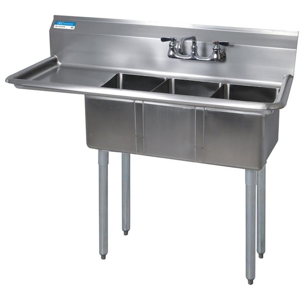 Three compartment convenience store sink measures 47-1/2"Wx19-13/16"D with 10"x14"x10" deep compartments and 8" O.C. splash mount faucet holes. The deck and bowls are made from 18/304 stainless steel. There is a 15" drainboard on the left side. Sink includes basket drain. 9" backsplash prevents hard to clean messes. Legs are made from galvanized steel and sink has side crossbracing for stability. Plastic bullet feet are adjustable. Tested and certified by NSF.
