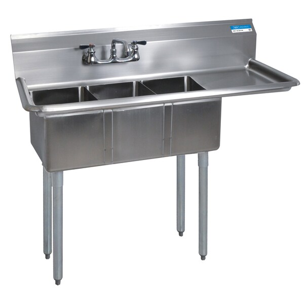 Three compartment convenience store sink measures 47-1/2"Wx19-13/16"D with 10"x14"x10" deep compartments and 8" O.C. splash mount faucet holes. The deck and bowls are made from 18/304 stainless steel. There is a 15" drainboard on the left side. Sink includes basket drain. 9" backsplash prevents hard to clean messes. Legs are made from galvanized steel. Plastic bullet feet are adjustable. Tested and certified by NSF.