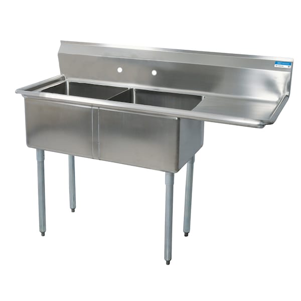 Two compartment sink measures 52-1/2"Wx25-13/16"D with 16"x20"x12" deep compartments. The deck and bowls are made from T-304 16 gauge stainless steel. There is a 18" drainboard on the right side and the 1-1/2" front and side edges are rolled. Sink includes basket drain and accomodates 8" on center faucets. 9" backsplash prevents hard to clean messes. Legs are made from galvanized steel. Plastic bullet feet are adjustable. Tested and certified by NSF.