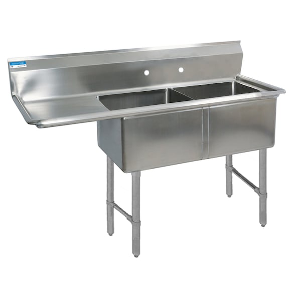 Two compartment sink measures 56-1/2"Wx23-13/16"D with 18"x18"x12" deep compartments. The deck and bowls are made from T-304 16 gauge stainless steel. There is a 18" drainboard on the left side and the 1-1/2" front and side edges are rolled. Sink includes basket drain and accomodates 8" on center faucets. 9" backsplash prevents hard to clean messes. Legs are made from galvanized steel. Plastic bullet feet are adjustable. Tested and certified by NSF.