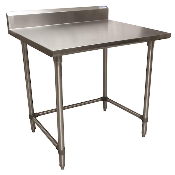 This work table measures 36"Wx30"D. The top is made from 16/304 stainless steel and is reinforced with channels for durability. The open base is stabilized with galvanized steel side and rear bracing. The 5" riser prevents objects from sliding off. The galvanized steel legs and high impact corrosion resistant feet are adjustable. This table is tested and certified by NSF.