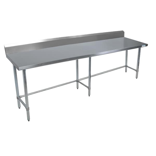 This work table measures 96"Wx30"D. The top is made from 16/304 stainless steel and is reinforced with channels for durability. The open base is stabilized with galvanized steel side and rear bracing. The 5" riser prevents objects from sliding off. The galvanized steel legs and high impact corrosion resistant feet are adjustable. This table is tested and certified by NSF.