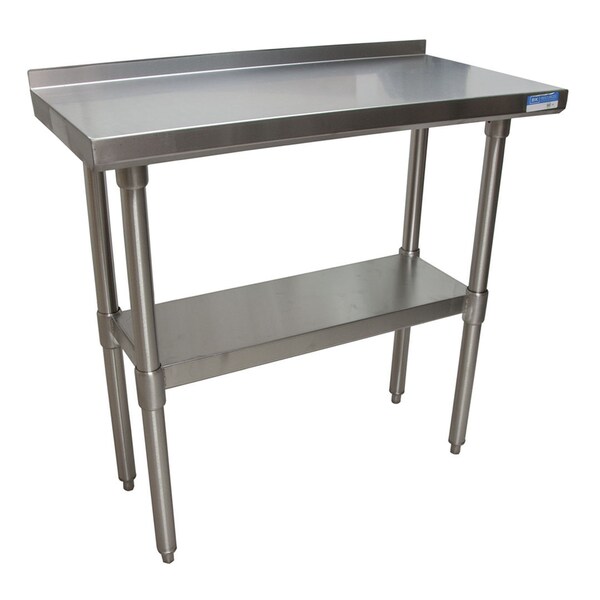 This Work Table measures 48"Wx18"D. The top is made from 18/430 Stainless Steel which is reinforced with channels and has turndown edges on the front and sides. The 1-1/2" rear riser prevent objects from sliding off. Table legs are made from stainless steel and are 1 5/8" in diameter. The stainless steel undershelf and plastic bullet feet are adjustable. This table is tested and certified by NSF.