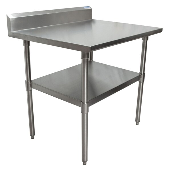 This Work Table measures 30"Wx30"D. The top is made from 18/430 Stainless Steel which is reinforced with channels and has turndown edges on the front and sides. The 5" rear riser prevent objects from sliding off. Table legs are made from stainless steel and are 1 5/8" in diameter. The stainless steel undershelf and plastic bullet feet are adjustable. This table is tested and certified by NSF.
