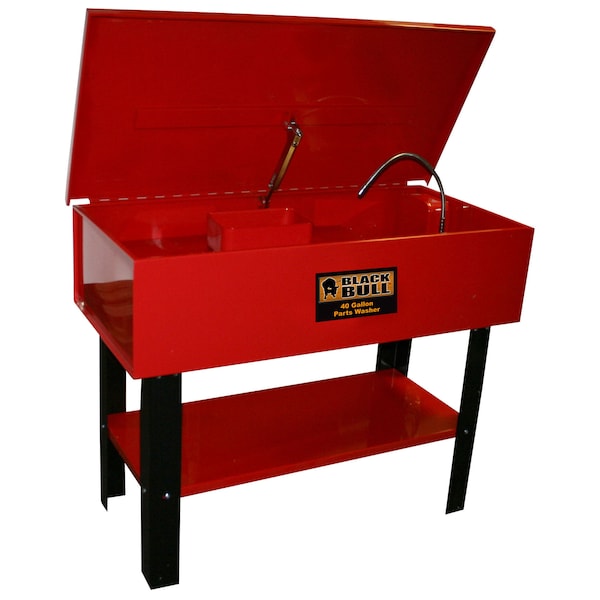 The Black Bull 40 Gallon Parts Washer removes grease, grime and oil from engine components, oil pans, carburetors and more.Fully enclosed electric pump recirculates fluid for quick parts washing, red powder coat paint finish, heavy-duty steel construction, 120 volts / 60 hz water pump, fusible link arm and steel lid. Water Based solvent Only.Overall dimensions: 21-7/16"D x 45"W x 35-13/16"H (closed); 55-3/8"H (open).40 gallon tank capacity/12 gallon maximum solvent capacity max.