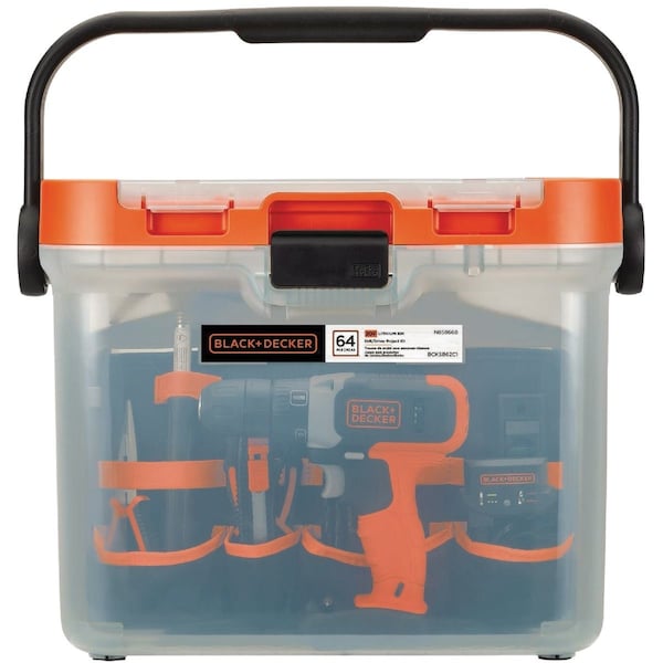 20V MAX lithium-ion drill/driver with 63-piece hand tool and accessory home project kit. This kit is the perfect solution for homeowners to take on decorating assembling repair and installation projects around the house. Kit comes packaged in a translucent toolbox to provide visibility portability and storage. Modular tool tray helps provide organization for each tool. Includes: 20V MAX lithium-ion drill driver 20V MAX 2.0 Ah battery charger 32 fastening bits 12 hex keys 10 drilling bits utility knife tape measure needle nose pliers slip joint pliers level hammer and picture hanging hardware kit.