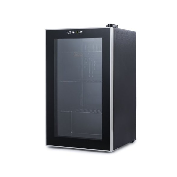Always keep your favorite drinks cold and refreshing with this BLACK+DECKER 2.4 cu ft mini fridge. With its compact dimensions of 16.9 in. x 18.1 in. x 29.1 in. and weight of 44.1 lbs., this small refrigerator has a 76-can capacity, ideal as a home office coca cola mini fridge or mini refrigerator for bedroom. When it comes to quality beverage refrigerators, ours is superior with outstanding features such as a see-through mini fridge glass door, sleek black exterior, adjustable leveling legs, fridge door with handle as well as adjustable refrigerator shelves. This small fridge includes an adjustable manual thermostat control, allowing you to select your temperature range anywhere from 37 deg.F - 61 deg.F. You can even use this mini fridge as a wine cooler and wine fridge for some of your favorite wine bottles. Our refrigerator and mini cooler entails compressor cooling technology that enables even and thorough chilling. Whether you're using this mini fridge 2.6 cubic feet as an office refrigerator, can cooler for home, soda fridge, dorm fridge or in your man cave - you can rest assured a crisp, cool and refreshing beverage is always within reach.
