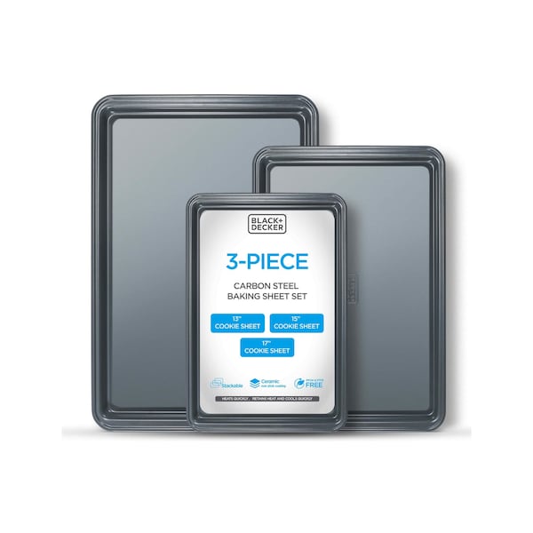 Our BLACK+DECKER 3-Piece Carbon Steel Baking Sheet Set is a must-have addition to your kitchen bakeware collection. This premium baking set is crafted with 0.4mm carbon steel, ensuring durability while maintaining a lightweight profile. The set includes three versatile sizes: a 13 small cookie sheet, a 15 cooking sheet, and a 17 large baking sheet, catering to all your baking needs from small cookie sheets to large cookie sheets for baking. Each baking sheet in this set features a high-performance ceramic non-stick coating, ensuring effortless food release and easy cleanup. The baking sheets non stick are PFOA PTFE Free, making them a safe choice for your kitchen. The sleek black finish not only adds a touch of elegance to your kitchen. Designed for high performance, these cookie sheets for baking nonstick can withstand oven temperatures up to 450 degrees Fahrenheit. The carbon steel construction retains heat effectively, ensuring even baking and browning of your favorite cookies, pastries, and other baked goods. Additionally, these baking sheets heat and cool quickly, allowing you to achieve perfect results every time. The rimmed edges of each baking tray help prevent spills and drips, making them ideal for a variety of baking applications. Whether you're baking a batch of cookies, roasting vegetables, or preparing a sheet pan dinner, this baking sheet set has got you covered. The versatile nature of these baking trays makes them perfect for both novice bakers and seasoned chefs. Elevate your cooking game with the BLACK+DECKER 3-Piece Carbon Steel Non Stick Baking Sheet Set. This exceptional bakeware set is perfect for those who demand quality, performance, and style in their kitchen baking endeavors.
