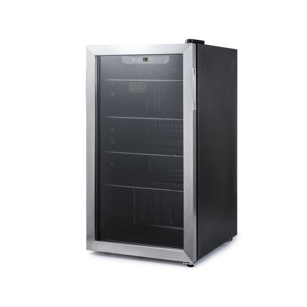 Always keep your favorite drinks cold and refreshing with this BLACK+DECKER 2.4 cu ft mini fridge. With its compact dimensions of 16.9 in. x 18.1 in. x 29.1 in. and weight of 44.1 lbs., this small refrigerator has a 76-can capacity, ideal as a home office coca cola mini fridge or mini refrigerator for bedroom. When it comes to quality beverage refrigerators, ours is superior with outstanding features such as a see-through mini fridge glass door, sleek black exterior, adjustable leveling legs, fridge door with handle as well as adjustable refrigerator shelves. This small fridge includes an adjustable manual thermostat control, allowing you to select your temperature range anywhere from 37 deg.F - 61 deg.F. You can even use this mini fridge as a wine cooler and wine fridge for some of your favorite wine bottles. Our refrigerator and mini cooler entails compressor cooling technology that enables even and thorough chilling. Whether you're using this mini fridge 2.6 cubic feet as an office refrigerator, can cooler for home, soda fridge, dorm fridge or in your man cave - you can rest assured a crisp, cool and refreshing beverage is always within reach.