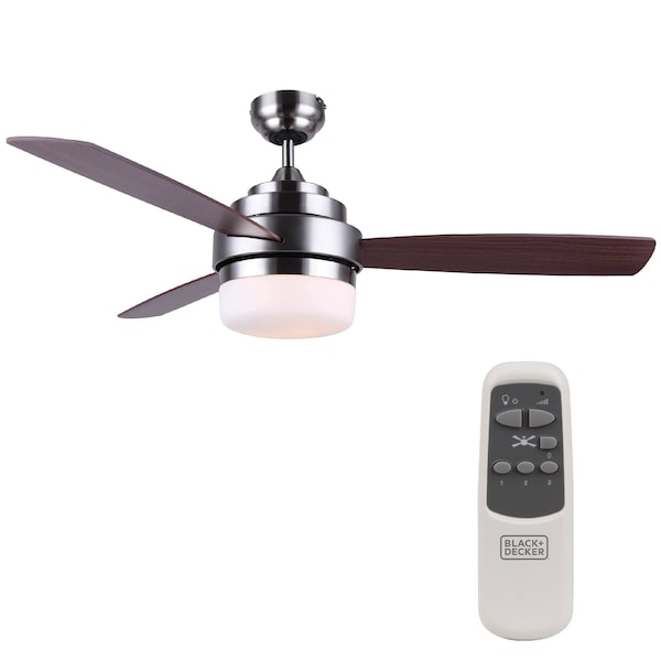 This BLACK+DECKER 52 inch ceiling fan with light will circulate air like never before. When it comes to quality ceiling fans, our attic fan 52 x 52 x 17.5 delivers powerful cooling thanks to impressive 3 reversible plywood blades in Mahogany and Natural Wood Finish. Choose your fan setting: HIGH 4800 CFM, MED 3360 CFM, and LOW 1920 CFM. Control your house fan with a convenient fan remote. Talk about ease! Our ceiling fan with lights remote control 15.4 lbs. comes in a modern nickel finish, which is cool and contemporary, sure to delight many aesthetics. This brush nickel ceiling fan cools rooms up to 270 square feet quickly and efficiently. What's better than a 52 inch ceiling fan with light and remote for a hot summer day? This brushed nickel ceiling fan is easy to operate, stunning to look at, and powerful in its ability to cool a room. In the world of lighting & ceiling fans, this BLACK+DECKER 52 ceiling fan with light and remote control ceiling fan ranks among some of the best. Enjoy a frosty white light that can set the ambiance of a room with 2 13W E26 bulbs sold separately. Stay comfortable and breezy any time of year with BLACK+DECKER's brushed nickel ceiling fan with light and ceiling fan remote!