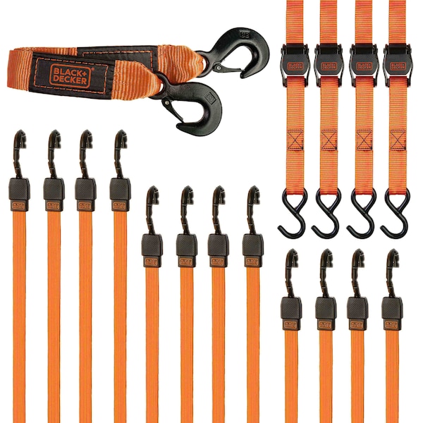 B+D 17Pc Tie Down Kit With Tow Strap/Cambuckle Straps/Premium Flat Bungees