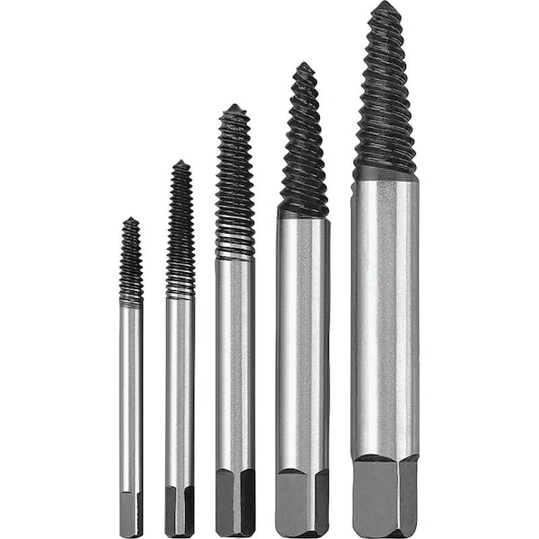 For removing broken screws and bolts. Set includes 5/64 in, 7/64 in, 5/32 in, 1/4 in and 9/32 in.