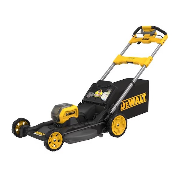 Dewalt 60V FlexVolt dual blade 21 Rear Wheel Drive mower. Runs off a single FlexVolt battery. 21 High-Efficiency Deck with Direct Drive Brushless Autosensing Motor Improved runtime better cut quality and reduced stalling load meter and user interface allowing real time feedbackAt the touch of one button telescope & fold handles into storage mode Vertical Storage Takes up 82% less space in vertical storage vs in operation Mulching Bagging or Rear Discharge