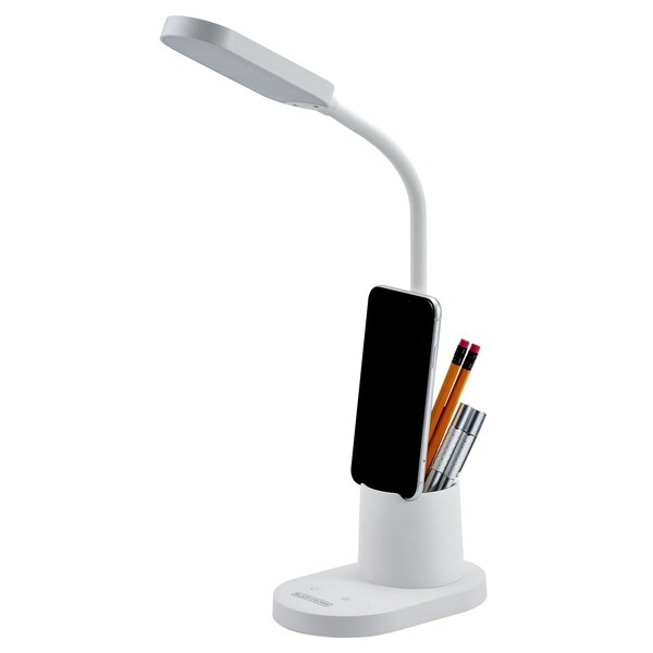 This Craft Light with Storage Cup + Phone Holder from BLACK+DECKER is everything you could ever need in a desk lamp! Bright, dimmable, LED lighting makes it easy to see even the smallest of details while crafting. Need an extra hand? Use the phone stand to easily watch instructional videos and tutorials, or make video calls! You can also keep your electronic devices charged with the USB charging port as well. The flexible lamp head allows you to maneuver your light for optimal crafting, while the touch buttons allow for easy stepless dimming and on/off features. In addition to those features, the lamp comes with a storage cup to store your go-to crafting tools and supplies! This all-in-one craft light from BLACK+DECKER is a must-have for any craft room or space! With Storage Cup, Phone Holder, Dimmable, Natural Daylight, Flexible Head, Touch-Sensitive Power Control, USB Port, White