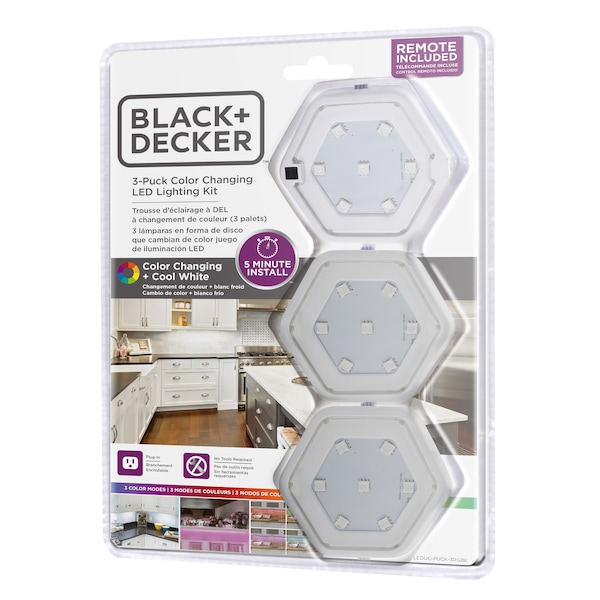 Cost effective and time sensitive, the BLACK+DECKER® 3-Pack LED Puck Light Kit in color changing and cool white will bring a pop of color to your kitchen. With a five-minute seamless installation for any kitchen, this is the go-to under cabinet lighting for a DIY homeowner. Each light has three color modes that highlight any under cabinet space with flicker-free lighting for up to 24”. Remote control features single color light options, dimming, smooth fading, strobing, flashing and powering on/off.
