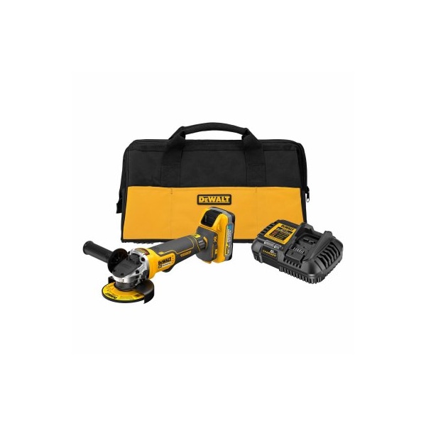 20V 4-1/2 brushless small angle grinder requires no time changing brushes and offers a longer motor life. It offers a high level of protection. Its break stops the wheel in 2 seconds or less. The Kickback Break engages maximum force to stop the wheel when there is a pinch stall or bind-up to reduce kickback. The grinder will also shut off in those events to further protect the user. This kit includes our most powerful battery in its class** the 20V MAX* DEWALT POWERSTACK 5.0 Ah battery. The DEWALT DCBP520 is compatible with all 20V MAX* tools and chargers.