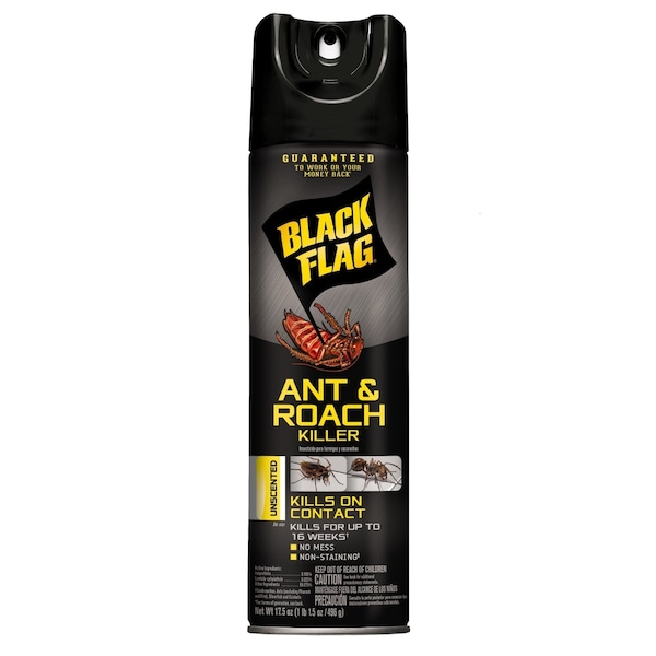 Black Flag Ant & Roach Killer controls roaches, ants, crickets, fleas, silverfish, spiders and other listed insects indoors on contact with an unscented, no-mess formula. Keeps controlling roaches, ants (excluding pharaoh and fire), silverfish and crickets for up to 16 weeks. Spiders (like black widow and wolf spiders) must be sprayed directly to be killed. Use along and behind baseboards; beneath and behind sinks, stoves, refrigerators and cabinets; around plumbing and other utility installations; around waste containers and wherever else these pests may find entrance. Use along and behind baseboards, appliances, sinks, pipes and plumbing. When treating for ants, spray around door and window frames, other entry points and trails.