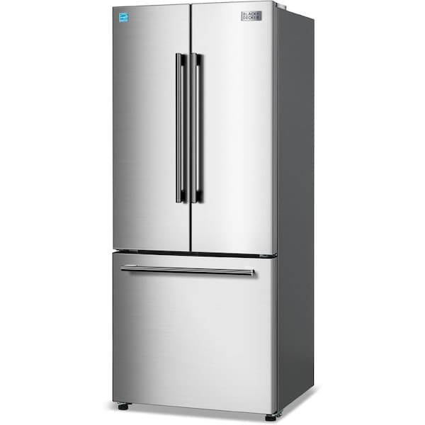 BLACK+DECKER 16 Cu. Ft. French Door Refrigerator offers a perfect blend of modern elegance and energy efficient functionality to any kitchen. This full size refrigerator with bottom mount freezer boasts a spacious interior, featuring an 11.15 cu. ft. fridge and a 5.06 cu. ft. freezer capacity. Its bottom freezer refrigerator design ensures easy access to all your frozen goods, while the bottom freezer compartment with two interior drawers provides ample storage for large items. The included ice machine produces up to 3.5 lbs. of ice per day. Built-in sensor stops making ice to prevent the ice bucket from overflowing. Power button on ice machine to turn production on and off when needed. The refrigerator's frost free freezer guarantees hassle-free maintenance, eliminating the need for manual defrosting. Fridge interior includes three full width removable glass shelves and two crisper drawers with glass cover. Additionally, each door includes three full width door bins, perfect for organizing your condiments and beverages. The grip handles on doors and drawers exude a lustrous accent, complementing the overall aesthetic of this kitchen refrigerator. Equipped with adjustable leveling legs for stability on uneven surfaces. The R600a refrigerant used is environmentally friendly. The interior of the fridge features LED interior lighting. Control the temperature with precision using the digital temperature control display, which allows you to switch between Fahrenheit and Celsius. Our refrigerator full size also features a smart mode temperature control to regulate temperature automatically, as well as a humidity control for the crisper. Measuring just under 30 inches in width, this large refrigerator fits seamlessly into most kitchen spaces and through standard doorways. Measures 28.35" x 29.33" x 70.4". Weighs 194 lbs. CSA safety certified. ENERGY STAR certified.
