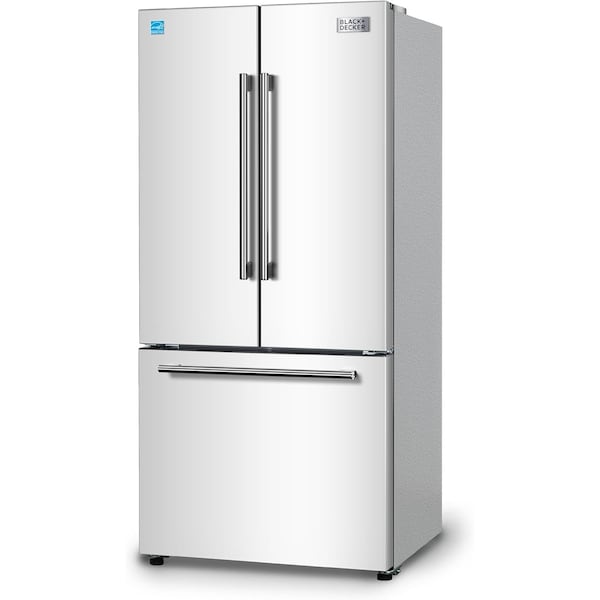 BLACK+DECKER 18 Cu. Ft. French Door Refrigerator offers a perfect blend of modern elegance and energy efficient functionality to any kitchen. This full size refrigerator with bottom mount freezer boasts a spacious interior, featuring a 12.5 cu. ft. fridge and a 5.4 cu. ft. freezer capacity. Its bottom freezer refrigerator design ensures easy access to all your frozen goods, while the bottom freezer compartment with two interior drawers provides ample storage for large items. The included ice machine produces up to 3.5 lbs. of ice per day. Built-in sensor stops making ice to prevent the ice bucket from overflowing. Power button on ice machine to turn production on and off when needed. The refrigerator's frost free freezer guarantees hassle-free maintenance, eliminating the need for manual defrosting. Fridge interior includes full width removable glass shelves and two crisper drawers with glass cover. Additionally, each door includes four full width door bins, perfect for organizing your condiments and beverages. The grip handles on doors and drawers exude a lustrous accent, complementing the overall aesthetic of this kitchen refrigerator. Equipped with adjustable leveling legs for stability on uneven surfaces. The R600a refrigerant used is environmentally friendly. The interior of the fridge features LED interior lighting. Control the temperature with precision using the digital temperature control display, which allows you to switch between Fahrenheit and Celsius. Our refrigerator full size also features a smart mode temperature control to regulate temperature automatically, as well as a humidity control for the crisper. Measuring 32.28 inches in width, this large refrigerator fits seamlessly into most kitchen spaces and through standard doorways. Measures 32.28" x 27.36" x 70". Weighs 207 lbs. CSA safety certified. ENERGY STAR certified.