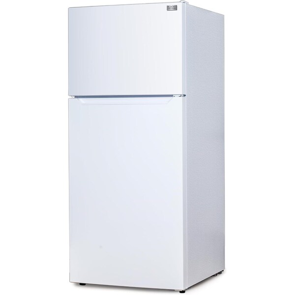 BLACK+DECKER 18.1 Cu. Ft. Top Mount Refrigerator with Freezer. This top freezer refrigerator is an ideal solution for those seeking a full size refrigerator with freezer that meets all food storage and cooling needs. Boasting 18.1 cu. ft. capacity, this refrigerator provides ample space to store fresh produce, beverages, and frozen goods. The included ice machine produces up to 3.5 lbs. of ice per day. Built-in sensor stops making ice to prevent the ice bucket from overflowing. Power button on ice machine to turn production on and off when needed. The adjustable temperature control ensures that your food is kept at the optimal temperature. With its frost-free auto-defrost feature, you can say goodbye to the tedious task of manual defrosting. The interior of this large fridge is designed with two full width glass refrigerator shelves. Two crisper drawers with cover are perfect for keeping fruits and vegetables fresh and crisp. Additionally, the four half-width and one full-width refrigerator door bins offer convenient storage for bottles, jars, and other items. The freezer compartment of this refrigerator full size with freezer includes one full width freezer shelf and two full width freezer door bins. This kitchen refrigerator features reversible doors, allowing you to customize the door swing to suit your kitchen layout. The recessed door handles add a touch of modern elegance, while the adjustable leveling legs ensure stability on any surface. Inverter compressor with R600a refrigerant, which has no ozone depletion potential. Illuminate your interior with the built-in light. Measuring less than 30 inches in width, this large refrigerator fits seamlessly into most kitchen spaces and through standard doorways. Measures 29.72" x 30.12" x 66.14". Weighs 154 lbs. ETL listed. ENERGY STAR certified.