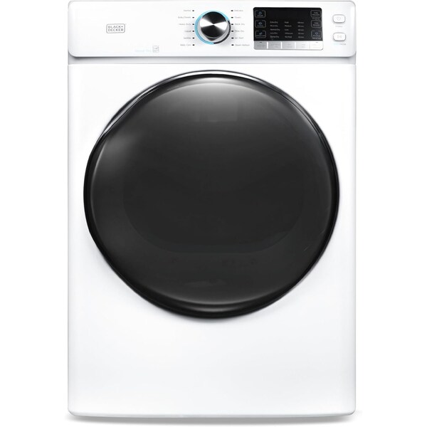 BLACK+DECKER 8.0 Cu. Ft. Front Load Dryer seamlessly integrates into any laundry room, offering efficiency and performance. Black and Decker dryer is distinguished by its LED digital display, which provides clear and intuitive control over your drying cycles. Simple dial control lets you choose from 12 cycle selections (Normal, Heavy Duty, Bulky/Sheets, Towels, Casual, Delicates, Sanitize, Baby Care, Quick Dry, Air Fluff, Steam Refresh and Time Dry). With 4 temperature settings (No Heat, Low, Medium and High) and 4 dryness settings (More Dry, Normal, Less Dry and Damp Dry), this clothes dryer ensures optimal care for your garments. Sensor dry technology measures moisture and automatically adjusts the heat for more efficient drying performance. Steam setting will automatically add steam to the drying cycle to reduce wrinkles and static while softening fabrics. This home appliance is designed with a wrinkle care setting to minimize creases, ensuring your clothes come out looking their best. The simple dial control allows users to switch effortlessly between sensor and manual dry settings, while the control lock function ensures the safety of your settings from accidental changes. The lint filter is conveniently located by the front door, making maintenance straightforward and hassle-free. Adjustable leveling legs ensure stability on any surface, and the reversible front loading door with pull handle provides easy access and adaptability to your laundry space. Please note that professional installation is required, and a ventilation ducting setup is necessary. Steam function requires connection to a water supply. The power cord kit is not included. This dryer machine offers side, rear, or bottom vent ducting options. ENERGY STAR qualified.