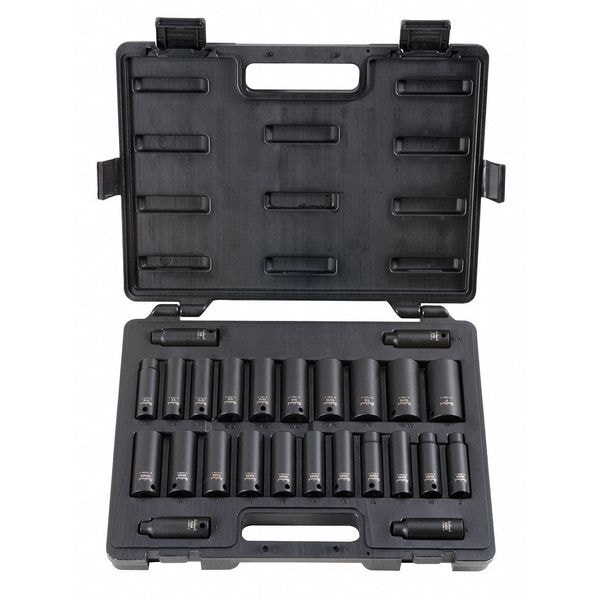 (25) 3/8" Drive 6 Point Deep Socket: 5/16", 3/8", 7/16", 1/2", 9/16", 5/8", 11/16", 3/4", 13/16", 7/8", 15/16", 1", 7mm, 8mm, 9mm, 10mm, 11mm, 12mm, 13mm, 14mm, 15mm, 16mm, 17mm, 18mm, 19mm; Blow Molded Case