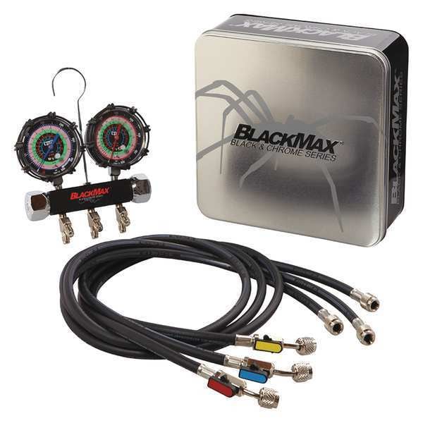 Manifold Gauge Set, Number of Valves 2, R-134A, R-22, R-404A, R-410A, Number of Hoses 3, 5 ft, 0 to 800 psi, 30 in Hg to 500 psi, +/-1.00 Percent, 1/4 in, Aluminum, Black Chrome Hoses, UL/SAE, Includes Carrying Case
