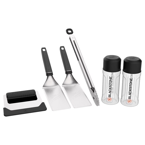 Have all the tools you need with the Blackstone Iron Forged Essentials Kit. With a dough scraper for scraping and chopping griddle spatulas and tongs for easily moving food around on the griddle and two leak-resistant squeeze bottles you'll be cooking up breakfast lunch and dinner in no time. The spatulas and tongs feature hanging loops for conveniently hanging the tool on griddle side shelf hooks and the dough scraper comes with a blade guard. With the Iron Forged Essentials Kit you'll be ready to tackle any meal anytime.
