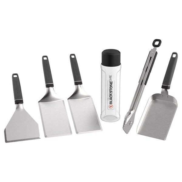Be ready to tackle any meal with the Blackstone Iron Forged Deluxe Kit. With griddle spatulas and tongs for easily moving food around on the griddle an angle scraper a griddle scoop and a 32 oz squeeze bottle youll be cooking up breakfast lunch and dinner in no time. The spatulas and tongs feature hanging loops for conveniently hanging the tool on the griddle side shelf hooks. With the Iron Forged Deluxe Kit youll be ready to tackle any meal anytime.