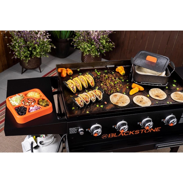 Making tacos just got a whole lot better and less messy with this Taco Kit. With a tortilla warmer and trivet, condiment tray, and two wire taco racks, preparing and serving tacos will never be the same. Keep your tortillas toasty and use the wire taco rack to build your tacos and easily transfer them from the griddle to your table. The items are dishwasher safe for an easy clean up, and the condiment tray nests inside the tortilla warmer making storage a breeze.
