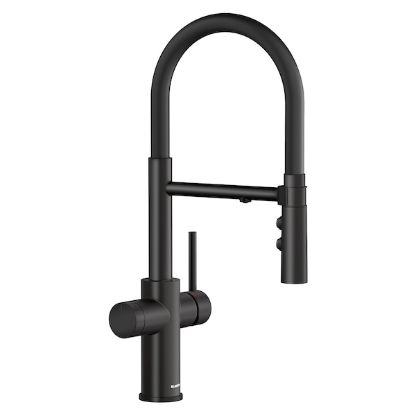 Combining functional elements and modern industrial flair, the CATRIS FLEXO FILTER 2-in-1 semi-professional faucet offers state-of-the-art design that provides both filtered and non-filtered water on demand. This faucets intuitive design features a single lever for tap water on the right and a separate dial handle on the left side for filtered water. The pull-down faucet includes an insulated dual handspray system and a durable magnetic docking arm that delivers filtered water through a discreet spout. The CATRIS FLEXO FILTER seamlessly connects to all common water filtration systems, ensuring you will always have access to hassle-free filtered water. Easily pair your CATRIS FLEXO FILTER with your favorite BLANCO sink and accessories for a fully-integrated BLANCO UNIT. With this setup, you'll have everything you need to drink, prep and clean all in one place.