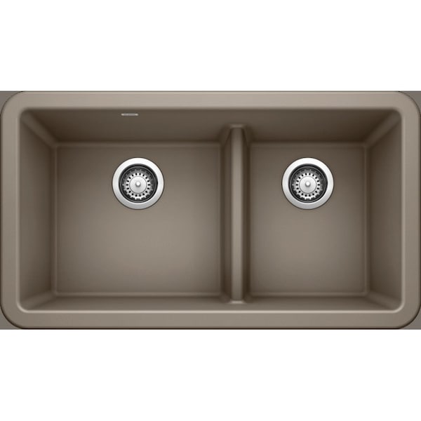 The BLANCO Ikon Silgranit 33" Apron-Front Farmhouse Kitchen Sink with Low Divide - Truffle has a mounting type of Apron Front, an overall length of 33", two bowls, an overall width of 19", an overall height of 9.25", zero holes, a material of Granite Composite, a color of Truffle, a weight of 51 lb, a limited lifetime manufacturers warranty, a type of Kitchen, and a minimum cabinet size of 36.