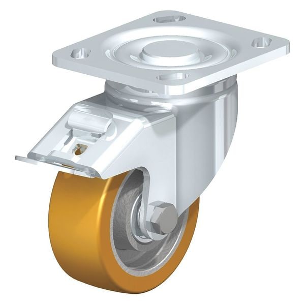 Swivel Plate Caster, PU, 4", Brake, Caster Wheel/Tread Material: Cast Iron/Polyurethane Elastomer