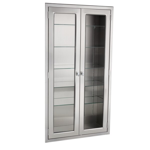 This built-in desk cabinet includes four stainless steel drawers below an open faced upper section with a sloped stainless steel writing surface, a dry erase back panel, and ceiling mounted fluorescent light fixture with an ON-OFF switch.