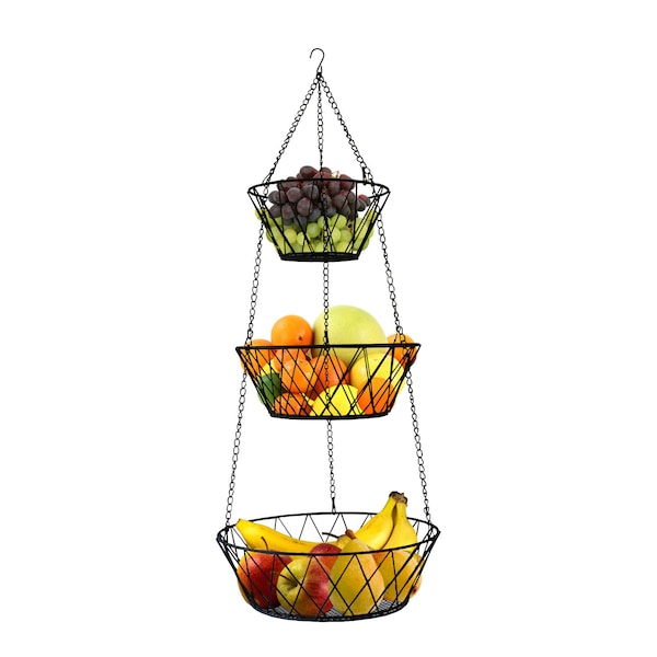 FUNCTIONAL & ELEGANT DESIGN: Our Hanging Fruit Basket features 3 tiers allowing for numerous fruits and room temperature groceries to be hung and organized with care. The X pattern of our baskets give an elegant touch to any home kitchen.