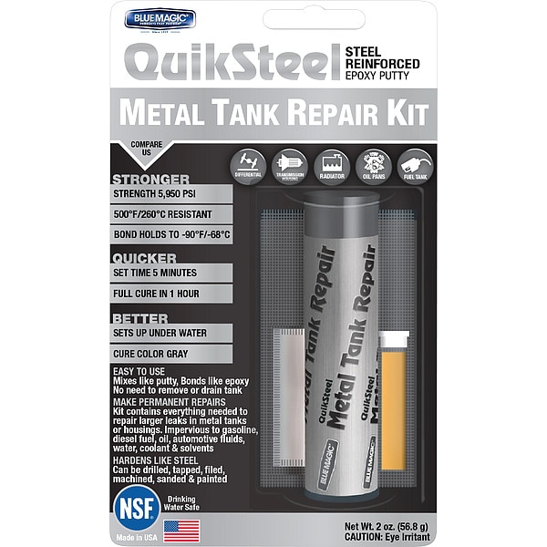 Tank Repair Kit, Color Dark Gray, 2 oz. Container Size, Mixing Ratio 1 to 1, Temp. Range (F) 500, Application Time 5 Minutes, Full Cure 1 Hour, Shear Strength (PSI) 740, Application For Repairing and Bonding Heavy Duty, Automotive, Home, Industrial, Farm and Marine Situations, Includes 2 Oz Cement, Saddle Soap, Alcohol Swab Pad, Screen and Sandpaper
