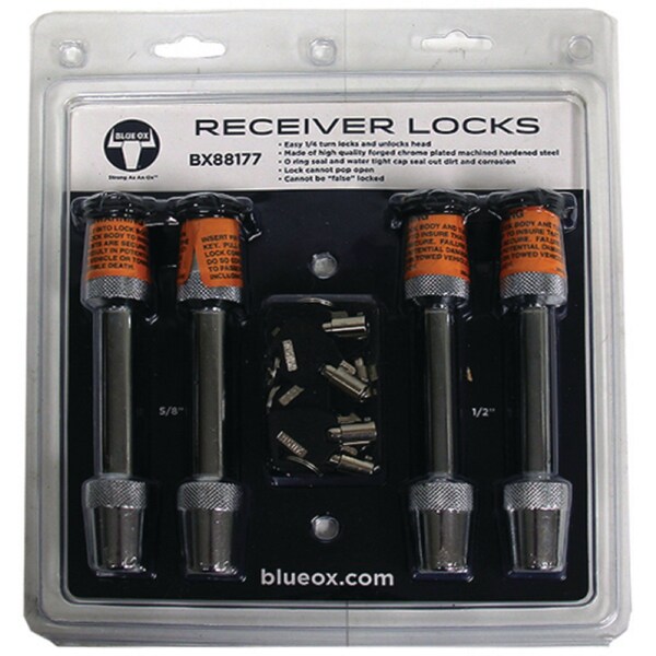 Locks Blue Ox tow bars to baseplate and receiver hitch to prevent theft. Prevents accidental unhitching. Chrome plated steel keys won't bend or break. Water-tight lock heads seal out dirt and corrosion. Three and Four lock sets have matched keys.