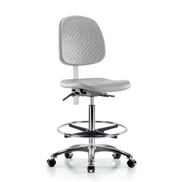 Class 10 Clean Room Gray Polyurethane High Bench Height Chair with Medium Back in Chrome is adjustable from 24.5-34.75 inches from the top of the seat to the floor and features ergonomic adjustments including seat height and locking back tilt, chrome adjustable foot ring, and cast-aluminum base with chrome-hooded, dual-wheel, self-braking, non-marring casters suitable for hard floors in chemical, soil, and puncture resistant polyurethane.