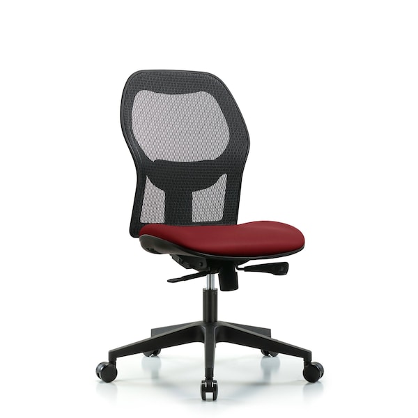 Executive Windrowe Mesh Back Chair is adjustable from 19-23 inches from the top of the seat to the floor and features adjustable lumbar support, comfort molded seat covered in Borscht Supernova Vinyl, and composite base with dual-wheel casters suitable for carpeted floors.