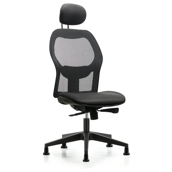 Executive Windrowe Mesh Back Chair is adjustable from 19-23 inches from the top of the seat to the floor and features adjustable lumbar support, comfort molded seat in Carbon Supernova Vinyl, headrest, and composite base with stationary glides suitable for both carpeted and hard floors.