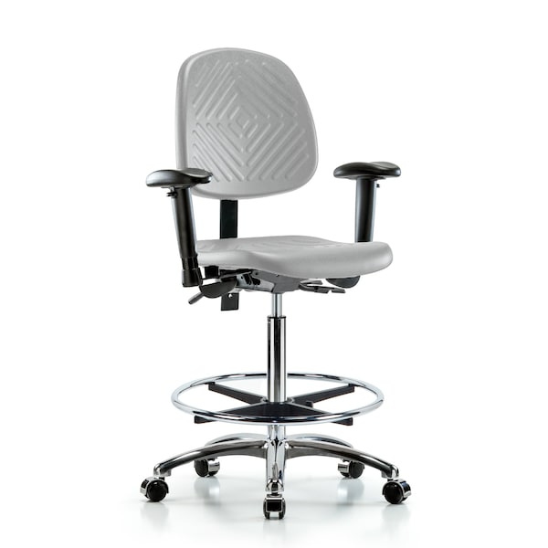 Gray Polyurethane High Bench Height Chair with Medium Back in Chrome is adjustable from 24.5-34.75 inches from the top of the seat to the floor and features ergonomic adjustments including seat height and locking back tilt, chrome adjustable foot ring, 6-way adjustable arm rests, and cast-aluminum base with chrome-hooded, dual-wheel, self-braking, non-marring casters suitable for hard floors in chemical, soil, and puncture resistant polyurethane.
