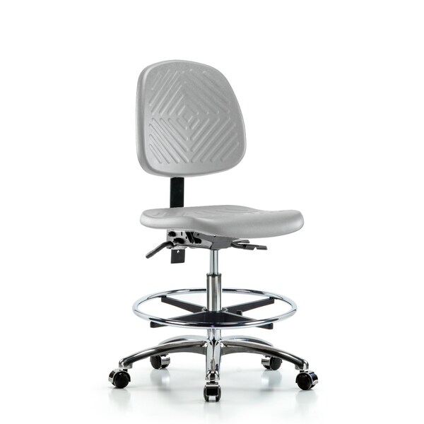 Gray Polyurethane Medium Bench Height Chair with Medium Back in Chrome is adjustable from 20.25-28 inches from the top of the seat to the floor and features ergonomic adjustments including seat height and locking back tilt, chrome adjustable foot ring, locking seat tilt, and cast-aluminum base with chrome-hooded, dual-wheel, self-braking, non-marring casters suitable for hard floors in chemical, soil, and puncture resistant polyurethane.