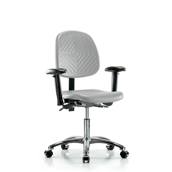 Gray Polyurethane Desk Height Chair with Medium Back in Chrome is adjustable from 17.5-22.75 inches from the top of the seat to the floor and features ergonomic adjustments including seat height and locking back tilt, 6-way adjustable arm rests, and cast-aluminum base with chrome-hooded, dual-wheel, self-braking, non-marring casters suitable for hard floors in chemical, soil, and puncture resistant polyurethane.