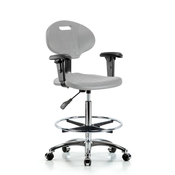 Poly Chair Chrome-High Bench Ht with Chrome Foot Ring, Adjustable Arms, &Chrome Casters in Gray Poly