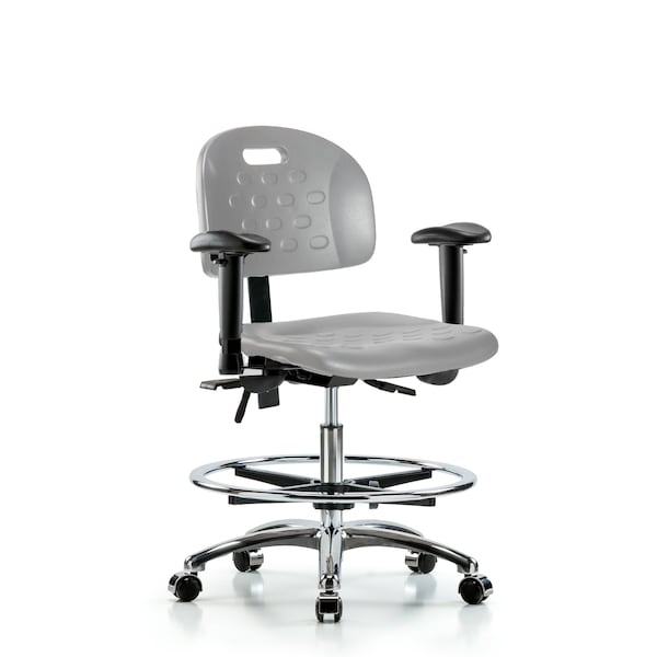 Poly Chair Chrome-Medium Bench Height with Adjustable Arms, Chrome Foot Ring, &Casters in Gray Poly