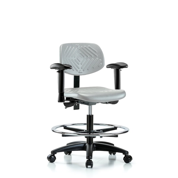 Poly Chair - Medium Bench Height with Adjustable Arms, Chrome Foot Ring, & Casters in Gray Poly