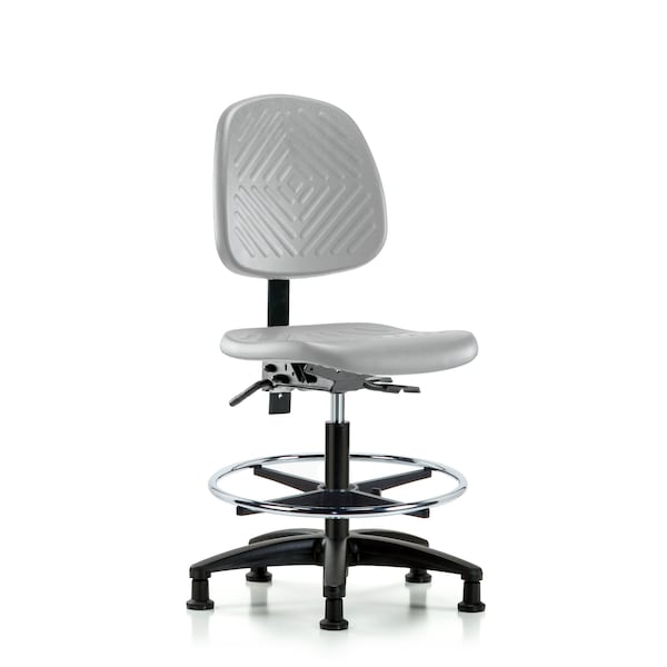 Gray Polyurethane Medium Bench Height Chair with Medium Back is adjustable from 19.25-26.75 inches from the top of the seat to the floor and features ergonomic adjustments including seat height and locking back tilt, chrome adjustable foot ring, locking seat tilt, and black, nylon-reinforced fiberglass base with stationary, non-marring glides suitable for hard floors in chemical, soil, and puncture resistant polyurethane.